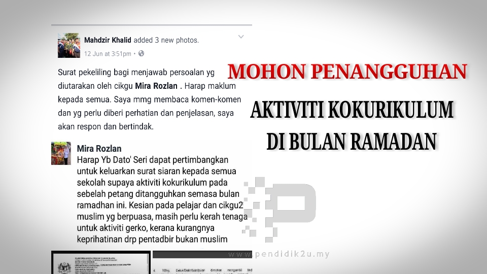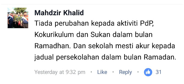 Beberapa hari lepas seorang guru telah menulis komen di page Dato’ Seri Mahdzir Khalid, mengetengahkan isu berkenaan aktiviti kokurikulum yang dilakukan di sekolah pada bulan puasa yang mana sesetengah sekolah ada juga melaksanakan aktiviti fizikal.
