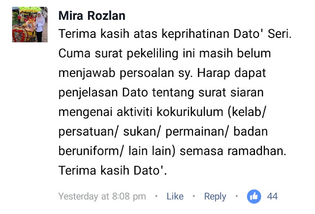 Mira Rozlan meminta KPM dapat mengeluarkan surat siaran supaya aktiviti kokurikulum pada sebelah petang ditangguhkan pada bulan ramadan, kerana kesian kepada cikgu muslim yang berpuasa terpaksa mengerah tenaga untuk aktiviti koko, kerana kurangnya keprihatinan daripada pentadbir bukan muslim.
