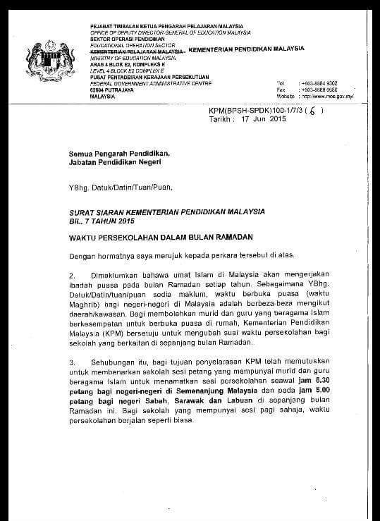Setelah membaca surat siaran tersebut, ia adalah surat siaran kebenaran tamat sesi persekolahan pada 5.30 petang bagi Semenanjung Malaysia dan 5.00 petang bagi Sabah dan Sarawak.