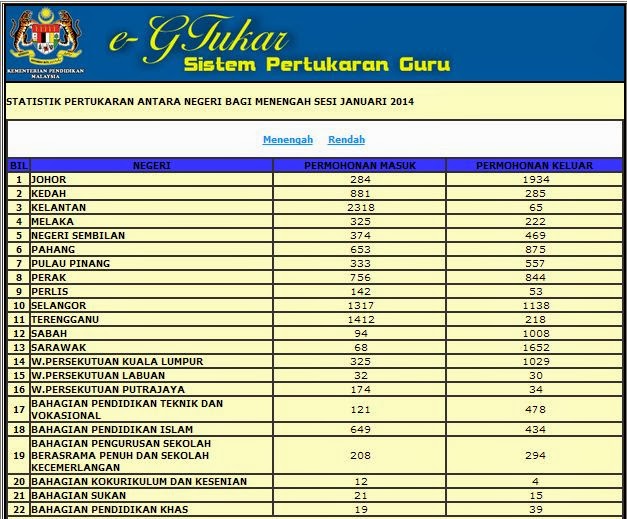 Keputusan Pertukaran guru menjadi perkara penting bagi setiap guru yang telah memohon. Ada yang telah memohon berkali-kali tetapi masih lagi bukan rezeki mereka. Apapun jangan putus asa untuk terus berdoa. Mungkin ada hikmah yang lebih besar yang kita sendiri tidak terfikir oleh minda kita. Bagi yang sedang menunggu keputusan egtukar bagi sesi Januari diharap dapat bersabar dan sentiasa berdoa agar dipermudahkan segala urusan. Banyak sekali kedengaran rungutan dari guru-guru berkenaan e-gtukar, terpaksa berjauhan dengan suami atau isteri tercinta, berjauhan dengan anak-anak, sehinggakan ada yang tertekan dan tidak dapat memberi tumpuan kepada tugasnya. Mari kita lihat statistik analisa pertukaran guru pada sesi Januari 2014 ini.