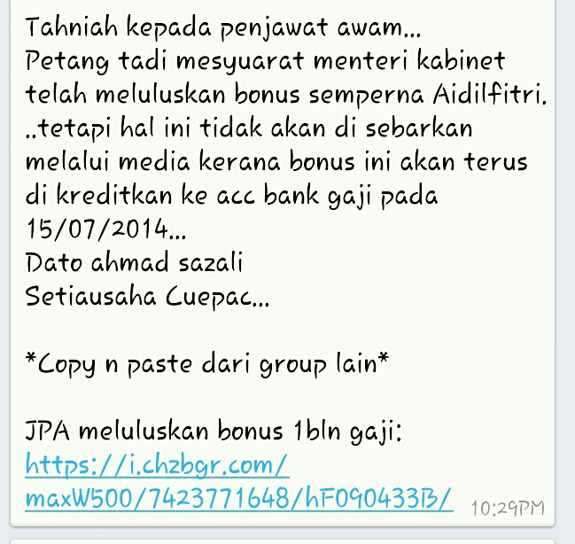 Beberapa hari ini banyak tersebar di whatsapp berita berkenaan Bonus Raya 2014, pasti anda juga ada yang mendapatnya. Tambahan pula di dalam penyebaran sms dan whatsapp itu juga dikatakan bonus raya kali ini adalah 1 bulan, wah, tentu ini menggembirakan semua penjawat awam bukan. Namum apakan daya ia sebenarnya hanyalah penyebaran berita palsu.