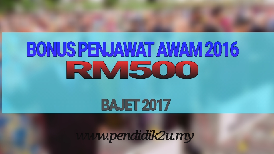 Perdana Menteri yang juga Menteri Kewangan mengumumkan Bonus Akhir Tahun 2016 bagi penjawat awam ialah RM500, dan RM250 untuk pesara kerajaan yang akan mula dibayar Januari 2017. Beliau mengumumkan bonus 2016 tersebut ketika membentangkan BAJET 2017 hari ini.