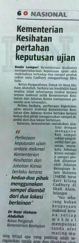 ” Rakyat Malaysia beragama Islam wajar meletakkan kepercayaan kepada bahagian Halal JAKIM yang merupakan autoriti di dalam hal seumpamanya di Malaysia. Saya yakin SOP mereka dan juga tahap profesionalisme mereka di dalam isu pelabelan halal boleh diyakini. Sebarang penyalahgunaan label mereka adalah di luar kawalan makmal mereka. Keputusan JAKIM yang mengesahkan bahawa dua jenia coklat Cadbury yang dikatakan mengandungi DNA babi (porcene) adalah tidak benar dan status kehalalannya kekal adalah wajar dipercayai dan diiktiraf oleh rakyat Malaysia beragama Islam.”