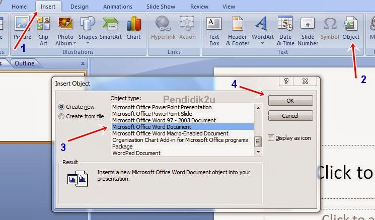 Kemudian pergi pula ke Slide Power Point – Insert – Object – Microsoft Word