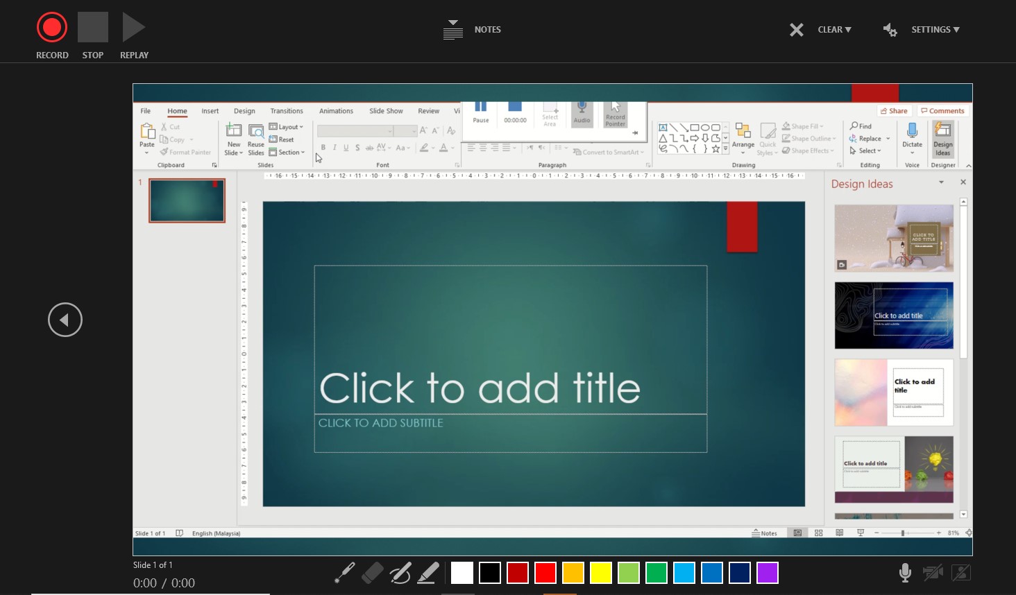 Pertama sekali anda perlu membuka perisian Powerpoint di komputer atau laptop anda. Kemudian anda lihat di bahagian atas ada ‘Recording’. Bagi yang tiada jangan bimbang, ikut langkah ini: