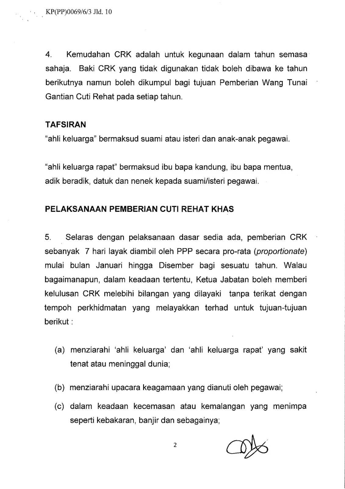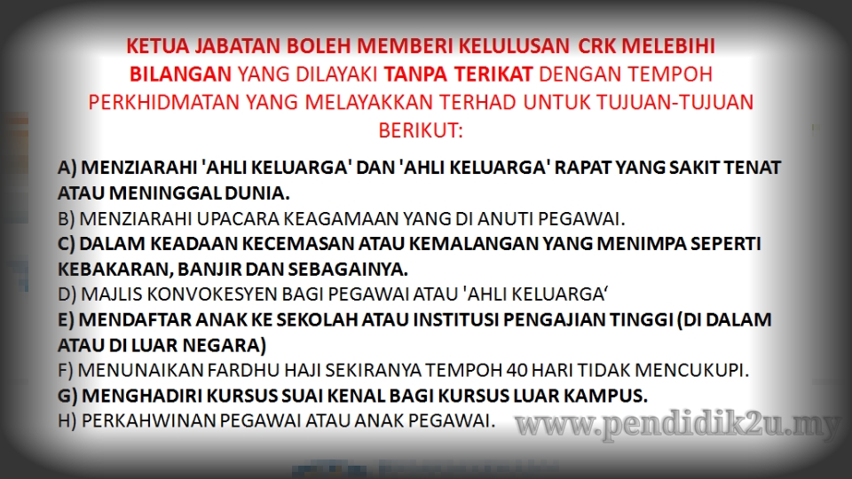 Selaras dengan pelaksanaan dasar sedia ada, pemberian CRK sebanyak 7 Hari (Update: Bermula 2018, 10 Hari) layak diambil oleh PPP secara Pro-Rata mulai bulan Januari – Disember bagi sesuatu tahun, walaubagaimanapun dalam keadaan tertentu, Ketua Jabatan boleh memberi kelulusan CRK melebihi bilangan yang dilayaki tanpa terikat dengan tempoh perkhidmatan yang melayakkan terhad untuk tujuan-tujuan berikut: