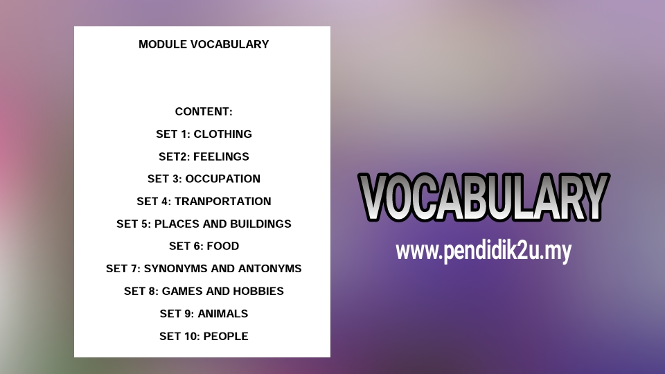 Di sini admin ingin kongsikan English Vocabulary sebagai bahan sokongan atau tambahan untuk guru dan murid.