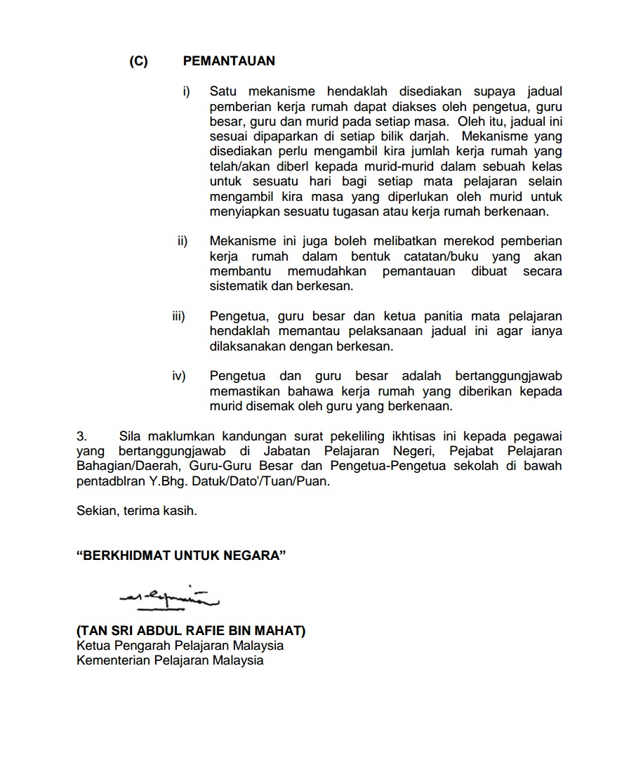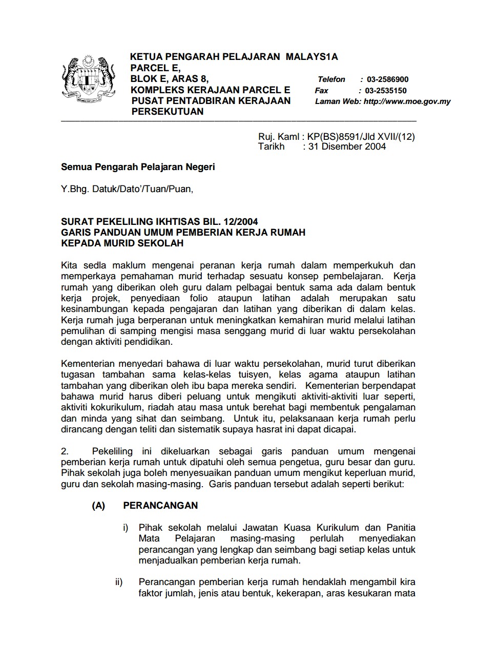 Di bawah adalah Pekeliling panduan atau rujukan bagi guru dalam memberikan latihan kepada murid-murid sebagai kerja rumah.