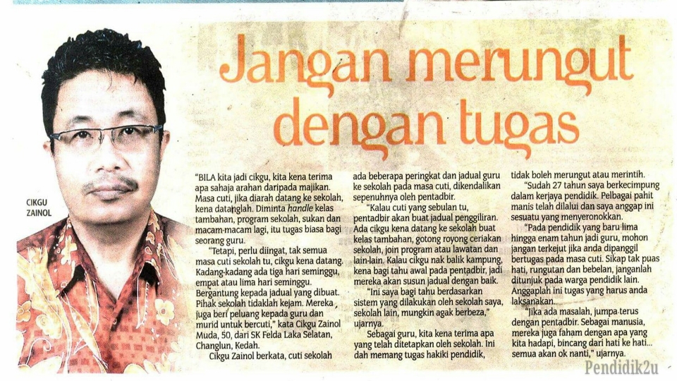 “Bila kita jadi cikgu kita kena terima apa sahaja arahan daripada majikan. Masa cuti, jika diarah datang ke sekolah, kena datanglah. Diminta handle kelas tambahan, program sekolah, sukan dan macam-macam lagi, itu tugas biasa bagi seorang guru.” Cikgu Zainol