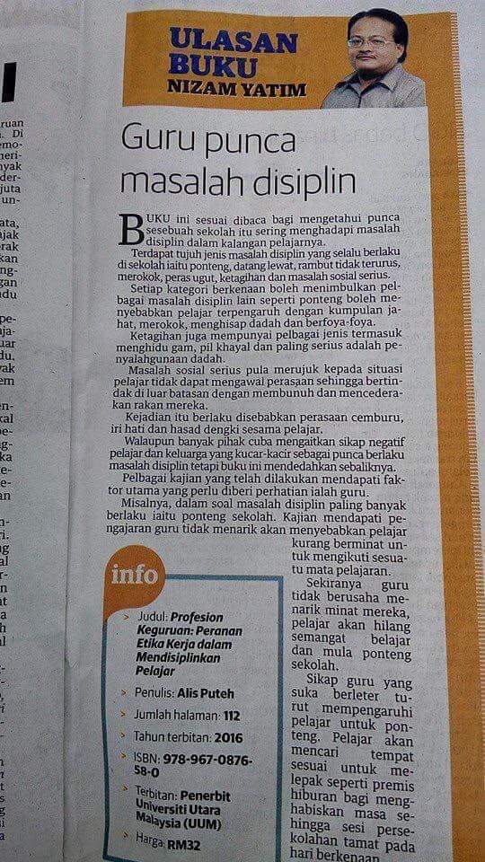 Buku Profesion Keguruan: Peranan Etika Kerja Dalam Mendisiplinkan Pelajar yang diterbitkan oleh UUM ini memberi gambaran disiplin pelajar adalah berkait dengan guru sebagai faktor utama yang perlu diberi perhatian.