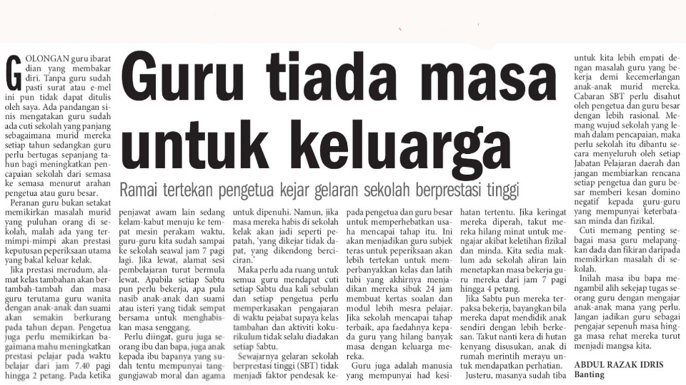Home info Guru Tiada Masa Untuk Keluarga? info Guru Tiada Masa Untuk Keluarga? By Pendidik2u - August 28, 2016 79 0 FacebookTelegramPinterest Guru tiada masa untuk keluarga.. Surat dari pembaca Berita Harian Metro Dan di bawah ini pula maklum balas dari Kementerian Pendidikan Malaysia Ini adalah artikel 2010, sebagai rujukan untuk bacaan sahaja. Printer Brother yang boleh print depan belakang dengan mudah Baju Tidur Perempuan Paling Murah Baju Kurung Kedah Baju Kurung Murah Baju Kurung Widuri Cantik Telefon Pintar Infinix 5G Murah