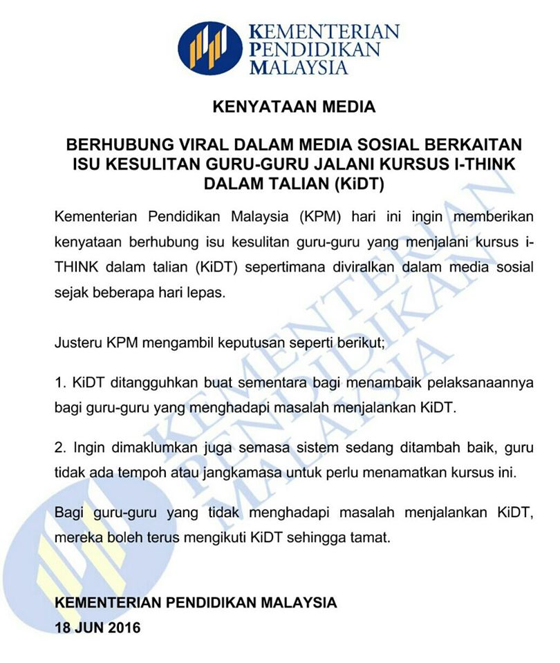 Saya memandang serius isu penggunaan aplikasi dalam talian I-THINK. Memandangkan ada guru-guru menghadapi masalah dalam menjalankan kursus I-THINK dalam talian (KiDT), maka keputusan berikut diambil :1. KiDT ditangguhkan buat sementara bagi menambah baik pelaksanaannya kepada guru-guru yang menghadapi masalah menjalankan KiDT.2. Ingin dimaklumkan juga semasa sistem sedang ditambah baik, guru tidak ada tempoh atau jangkamasa untuk perlu menamatkan kursus ini.Bagi guru-guru yang tidak menghadapi masalah menjalankan KiDT, mereka boleh terus mengikuti KiDT sehingga tamat.Terima kasih.