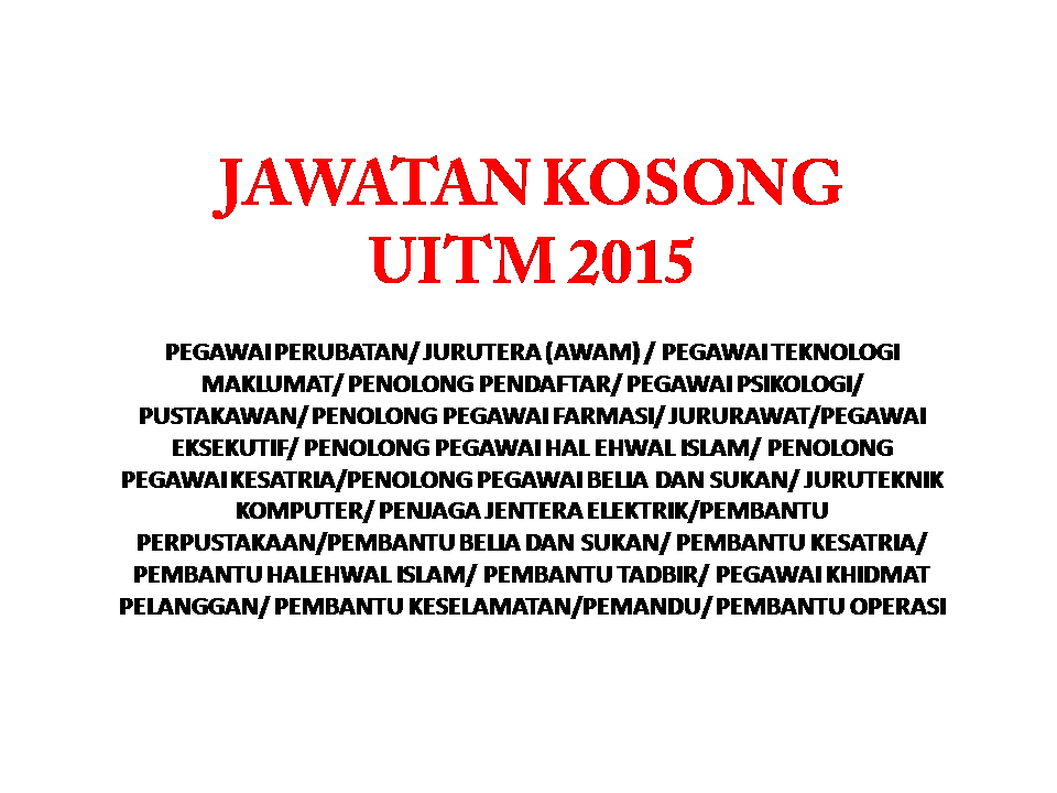 Universiti Teknologi MARA Cawangan Pahang dengan ini mempelawa calon-calon Warganegara Malaysia yang berkelayakan dalam bidang-bidang yang berkaitan untuk mengisi kekosongan jawatan Bukan Akademik secara Tetap/Kontrak di Universiti Teknologi MARA Cawangan Pahang (Kampus Jengka dan Kampus Raub)
