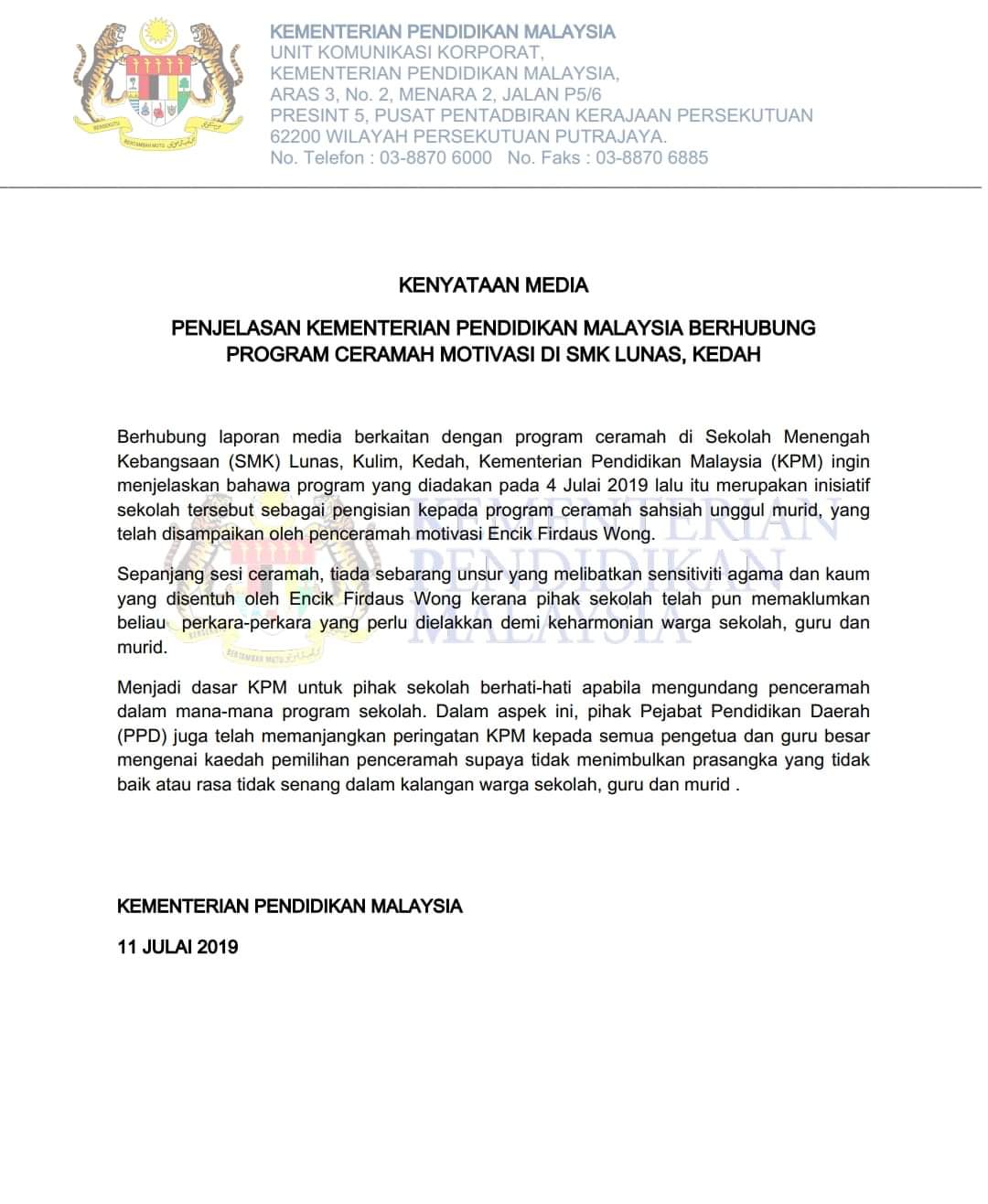 Kementerian Pendidikan Malaysia (KPM) hari ini mengeluarkan kenyataan media menjelaskan bahawa tiada sebarang unsur yang melibatkan sensitiviti agama dan kaum sepanjang sesi ceramah Firdaus Wong dalam program di sekolah di Kulim awal bulan ini.