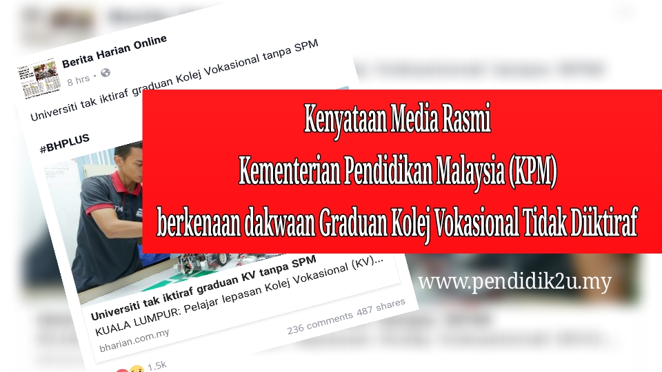 Berikut merupakan Kenyataan Media Rasmi Kementerian Pendidikan Malaysia (KPM) berkenaan dakwaan Graduan Kolej Vokasional Tidak Diiktiraf.