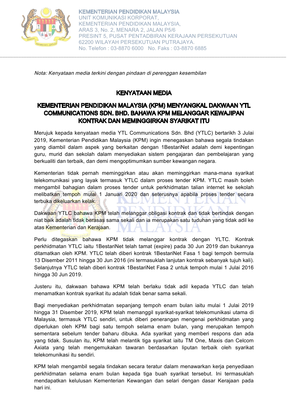 Kenyataan Media: KPM menyangkal dakwaan YTL