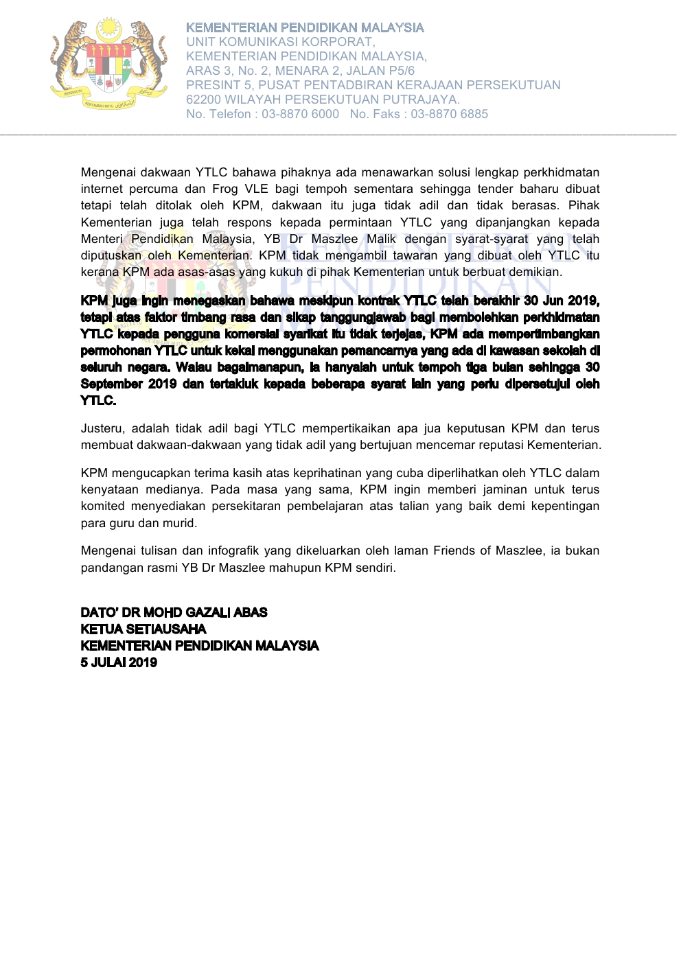 Kenyataan Media: KPM menyangkal dakwaan YTL