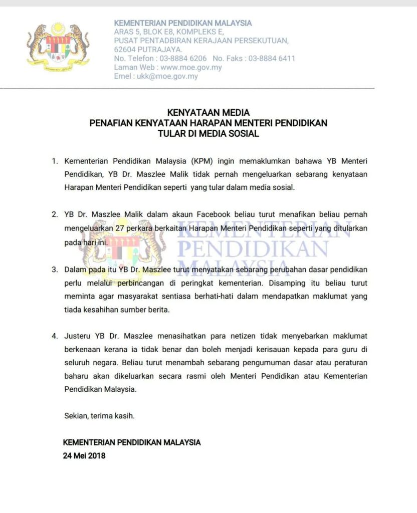 Justeru, YB. Dr. Maszlee menasihatkan para netizen tidak menyebarkan maklumat berkenaan kerana ia tidak benar dan boleh menjadi kerisauan kepada para guru di seluruh negara.