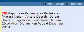 Keputusan Penempatan Pertukaran eGtukar (Antara Negeri, Antara Daerah , Dalam Daerah) Bagi Urusan Pertukaran Januari 2014 Akan Diumumkan Pada 6 Disember 2013