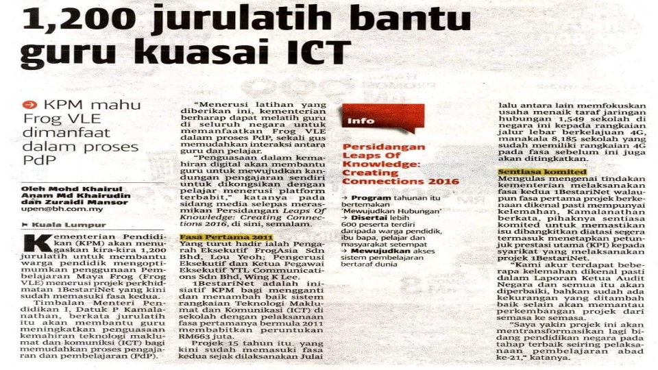 “Menerusi latihan yang diberikan ini, kementerian berharap dapat melatih guru di seluruh negara untuk memanfaatkan Frog VLE dalam proses PdP, sekali gus memudahkan interaksi antara guru dan pelajar.