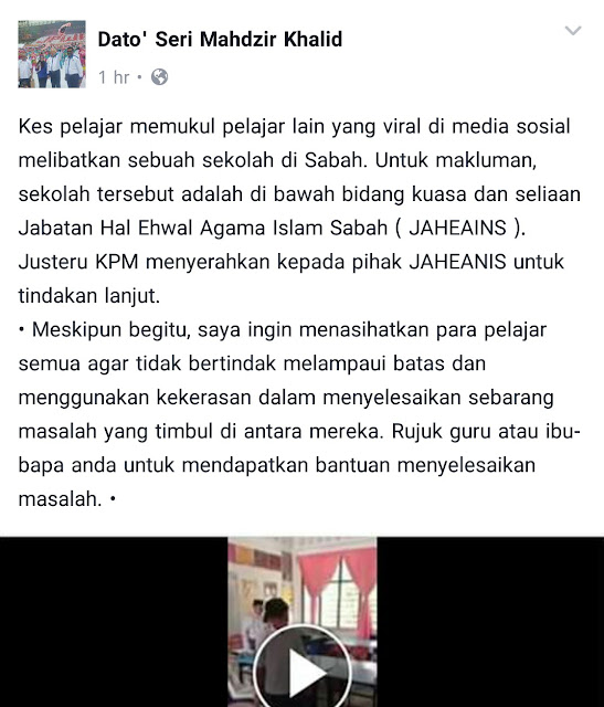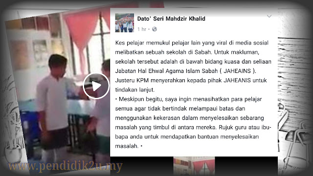 Kes pelajar memukul pelajar lain yang viral di media sosial melibatkan sebuah sekolah di Sabah. Untuk makluman, sekolah tersebut adalah di bawah bidang kuasa dan seliaan Jabatan Hal Ehwal Agama Islam Sabah ( JAHEAINS ). Justeru KPM menyerahkan kepada pihak JAHEANIS untuk tindakan lanjut.