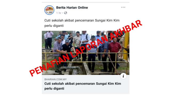 Berhubung berita di akhbar Berita Harian yang bertajuk “Cuti Sekolah Akibat Pencemaran Sungai Kim Kim Perlu Diganti” yang disiarkan pada 25 Mac 2019 (Isnin) jam 4.30 petang.