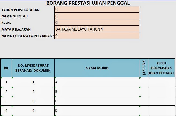 Modul Perekodan ini mempunyai 4 Worksheet (4 Bahagian) iaitu: Borang Perekodan, Borang Prestasi, Prestasi Ujian Penggal dan Pelaporan Murid.
