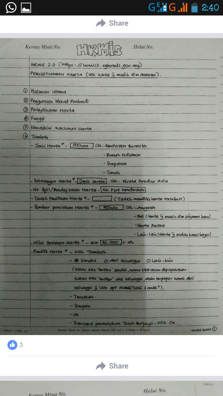 Berikut adalah nota panduan untuk mengisi perisytiharan harta menggunakan hrmis, nota ini ditulis oleh guru yang menghadiri taklimat.