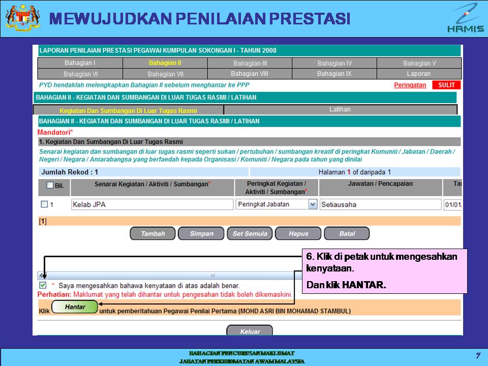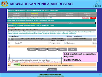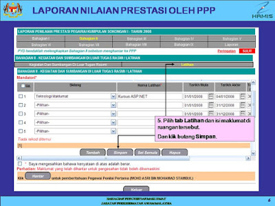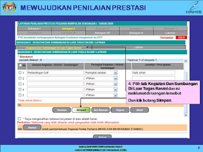 Sambungan Panduan Mengisi SKT Online Hrmis. Baiklah ini pula Panduan mengisi Penilaian Prestasi Pegawai Yang Dinilai (PYD), di ruangan ini anda perlu mengisi Kegiatan dan Sumbangan Luar Tugas Rasmi dan juga Latihan yang telah dihadiri. Pastikan anda ingat tarikh dan pencapaian anda di dalam kegiatan luar yang telah anda sertai.