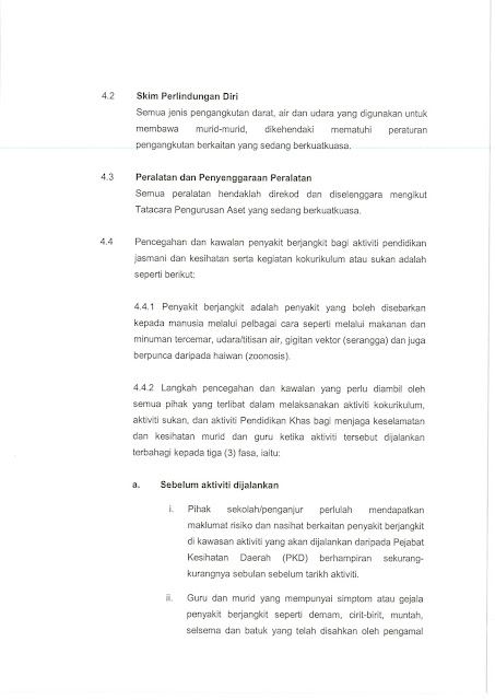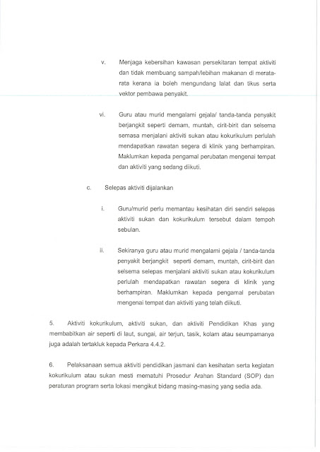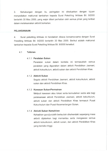 Ini merupakan pekeliling terbaru berkenaan panduan keselamatan semasa pengajaran Pendidikan Jasmani dan Kesihatan serta kegiatan kokurikulum dan sukan dalam dan luar sekolah, Guru yang mengajar Pendidikan Jasmani dan Kesihatan wajib ada pekeliling ini di dalam simpanan fail peribadi guru mereka. Guru-guru lain pun perlu ada kerana ia juga melibatkan aktiviti kokurikulum yang mana semua guru terlibat.