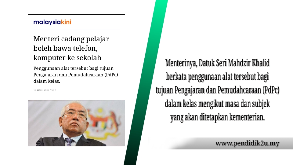 Menterinya, Datuk Seri Mahdzir Khalid berkata penggunaan alat tersebut bagi tujuan Pengajaran dan Pemudahcaraan (PdPc) dalam kelas mengikut masa dan subjek yang akan ditetapkan kementerian.