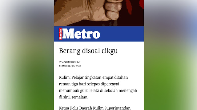 Ketua Polis Daerah Kulim Superintendan Abdullah Arshad berkata, pelajar terbabit ditahan selepas pihak polis menerima laporan daripada guru berusia 50 tahun itu pada 11 pagi semalam dan direman sehingga Rabu ini bagi membantu siasatan kes itu.