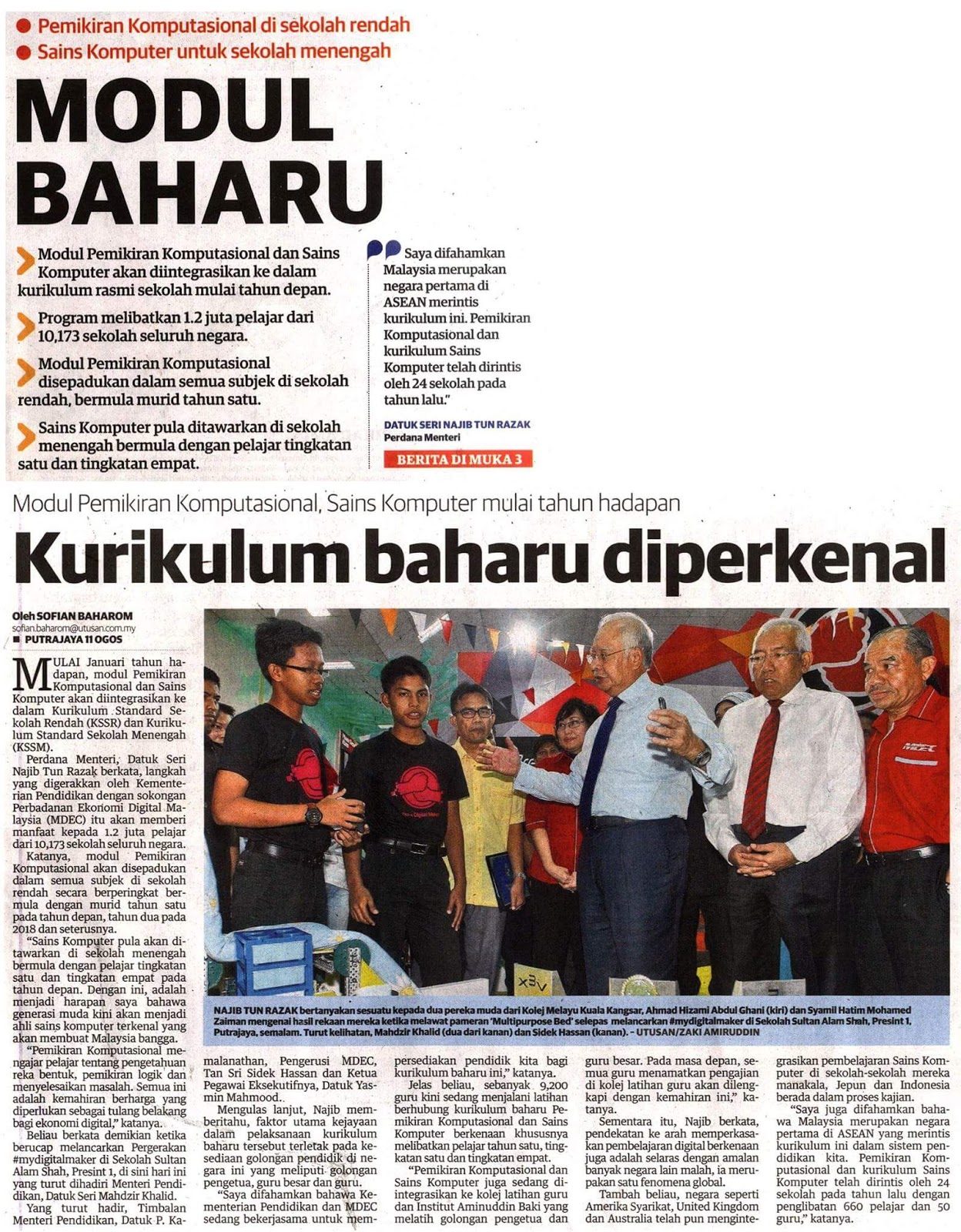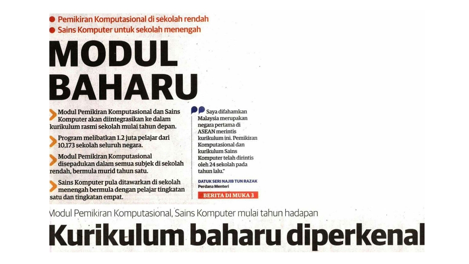Perdana Menteri, Datuk Seri Najib Razak, berkata melalui inisiatif itu, modul pemikiran komputasional akan diperkenalkan di peringkat sekolah rendah, dan diteruskan dengan pelaksanaan subjek Asas Sains Komputer bagi murid Tingkatan Satu dan Empat supaya golongan murid terdedah dengan kemahiran teknologi digital seperti pengekodan, algoritma dan menyelesaikan masalah.