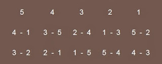 Untuk jumlah pasukan yang ganjil, mulakan dengan 1, dan tuliskan nombor-nombor peserta lain dari kanan ke kiri. Misalnya bentuk liga tujuh pasukan :
