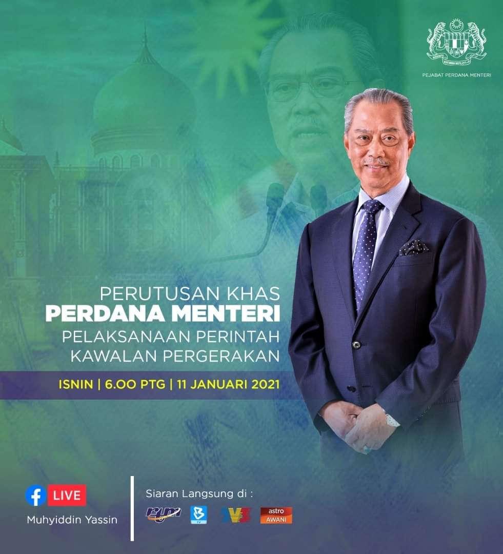 Perdana Menteri Tan Sri Muhyiddin Yassin diwar-warkan akan mengumumkan perkara penting berkenaan situasi pencegahan virus berjangkit Covid-19 hari ini (Isnin 11 Jan 2021 Jam 6 Petang)