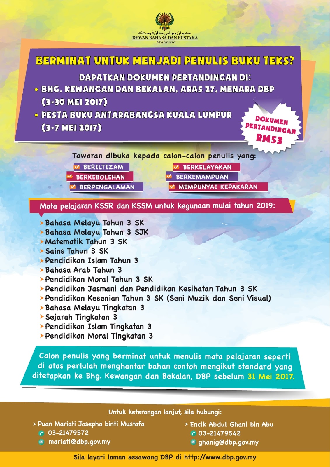 Calon-calon yang berminat untuk menjadi penulis buku teks boleh mengisi Borang Permohonan yang boleh di dapati di laman web www.dbp.gov.my