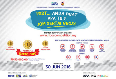 Untuk makluman YBrs. Tuan/Puan, di bawah Strategi Lautan Biru Kebangsaan atau National Blue Ocean Strategy (NBOS) yang digagaskan oleh YAB Perdana Menteri, Jabatan Perkhidmatan Awam (JPA) telah diberi mandat untuk menerajui inisiatif National Blue Ocean Competition (NBOSC) bagi kategori Perkhidmatan Awam. NBOSC telah dilancarkan oleh YAB Perdana Menteri pada 3 April 2016 di Borneo Convention Center Kuching (BCCK) sempena dengan Pelancaran Program Gabungan Rakan Entreprenuer Aspirasi Terhebat (GREAT). Inisiatif NBOSC ini mensasarkan penyertaan seluruh penjawat awam di peringkat Persekutuan, Negeri, Daerah dan Pihak Berkuasa Tempatan (PBT). NBOSC kategori Perkhidmatan Awam juga membuka penyertaan kepada warga Malaysia yang berusia 16 tahun ke atas termasuk pelajar-pelajar peringkat Institusi Pengajian Tinggi Awam/Swasta.