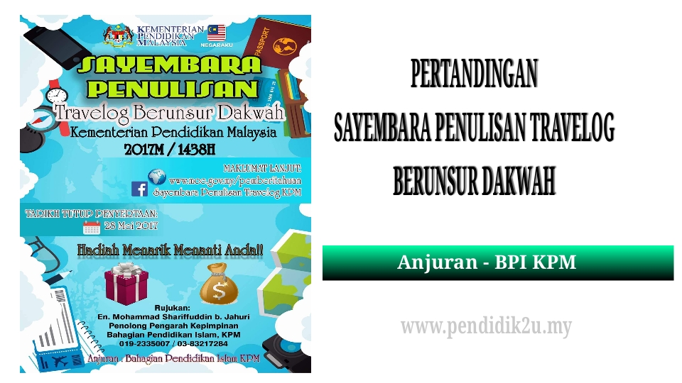 Bahagian Pendidikan Islam (BPI) KPM menganjurkan Sayembara Penulisan Travelog Berunsur Dakwah Peringkat KPM 2017. Pertandingan ini terbuka kepada: