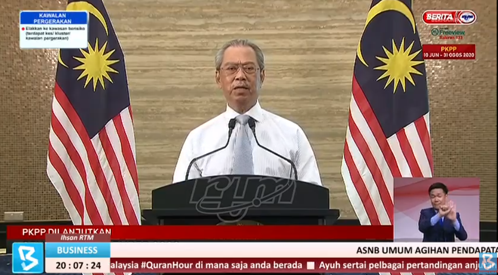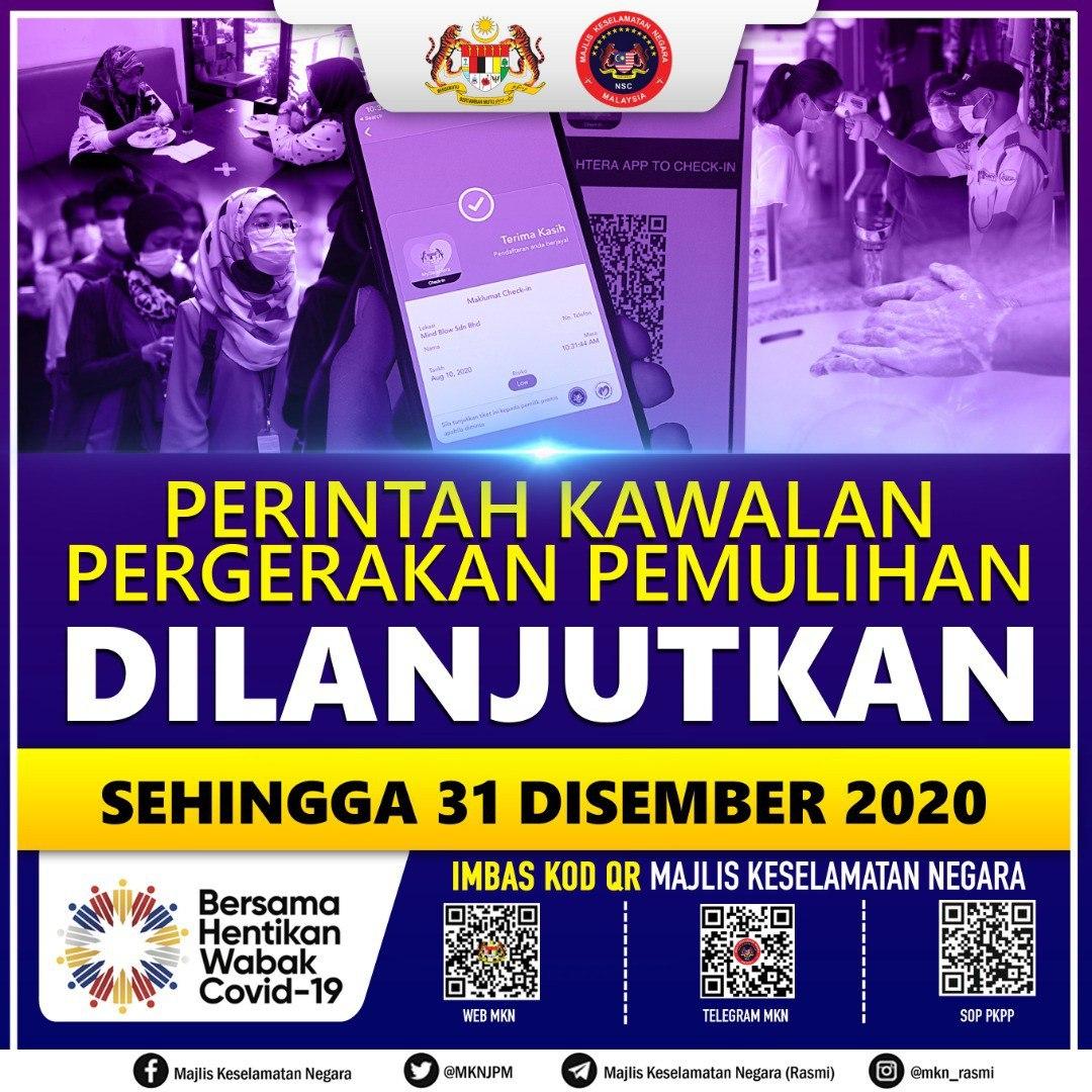 YAB Tan Sri Dato’ Hj. Muhyiddin bin Hj. Mohd Yassin dalam ucapannya Mengenai Perintah Kawalan Pergerakan Pemulihan (PKPP) sebentar tadi telah mengumumkan PKPP dilanjutkan sehingga 31 Disember 2020
