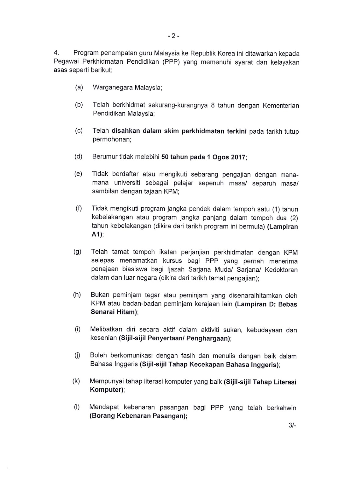 Program penempatan guru Malaysia ke Republik Korea ini ditawarkan kepada Pegawai Perkhidmatan Pendidikan (PPP) yang memenuhi syarat dan kelayakan asas seperti berikut: