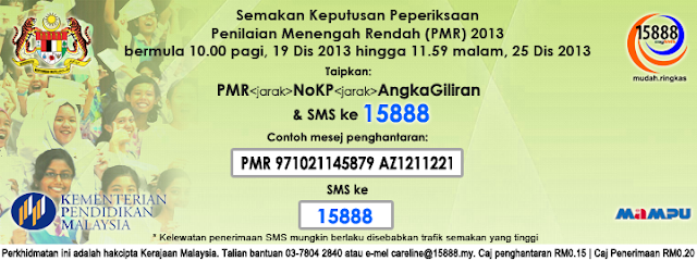 Keputusan PMR boleh disemak dengan SMS menggunakan kaedah berikut: