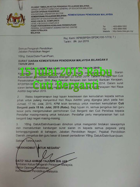Oleh itu, KPM telah memberi kemudahan cuti berganti pada 15 Julai 2015 Rabu, bagi memberi kemudahan dan keselesaan kepada orang ramai yang akan pulang ke kampung. Bagi tujuan ini, semua Pengetua dan Guru Besar perlu memohon cuti berganti dan cuti peristiwa kepada pendaftar masing-masing.