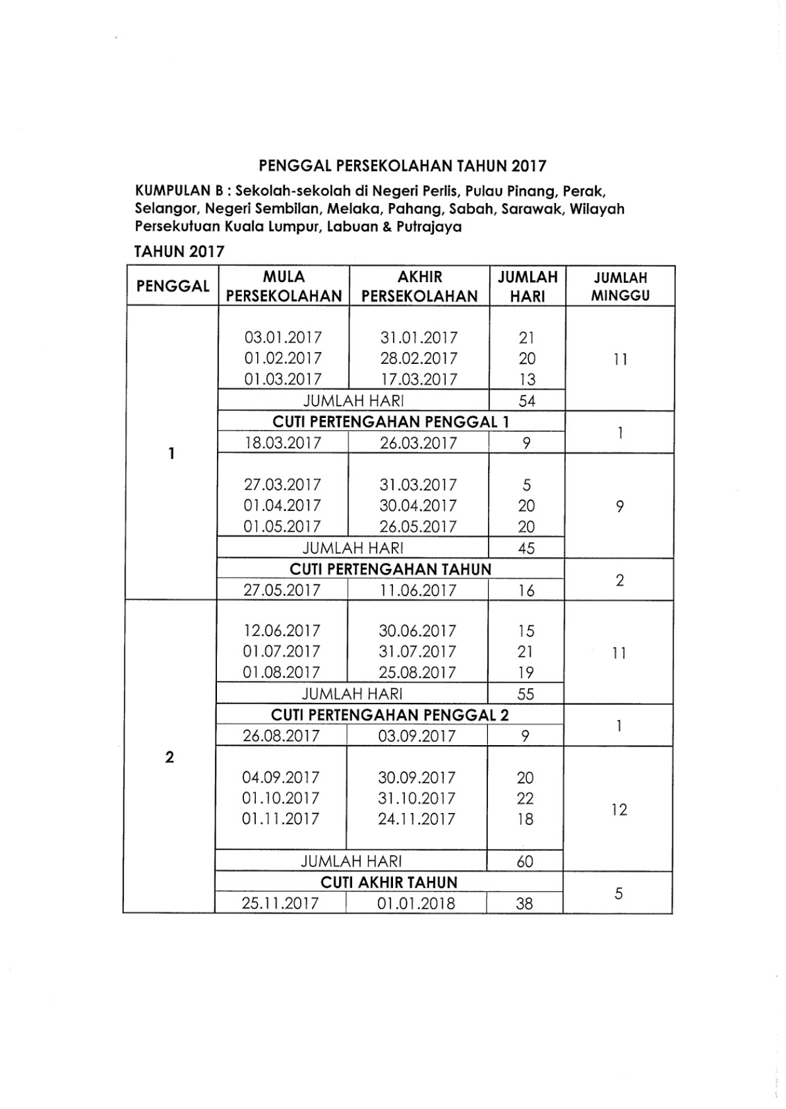 | Takwim Persekolahan 2017 Kumpulan B |