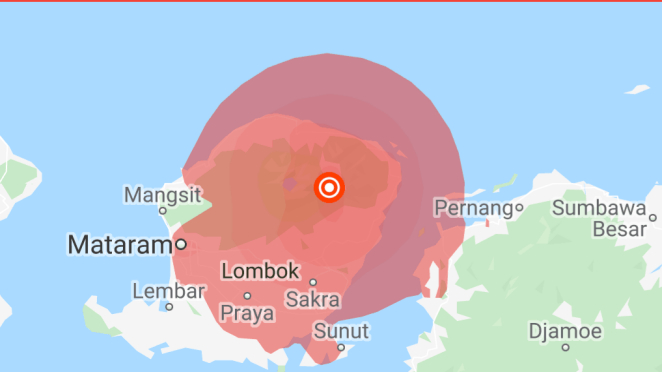 Gempa pertama bermagnitud 5.8 Skala Richter berlaku pukul 2.07 petang waktu Indonesia Barat, berpusat di 24km timur laut Timur Lombok – Nusa Tenggara Barat.