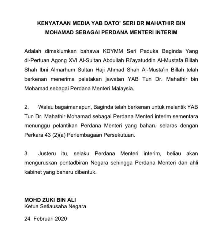 Ketua Setiausaha Negara Mohd Zuki Ali mengesahkan bahawa Yang di-Pertuan Agong Al-Sultan Abdullah Ri’ayatuddin Al-Mustafa Billah Shah telah berkenan melantik Dr Mahathir Mohamad sebagai perdana menteri interim.