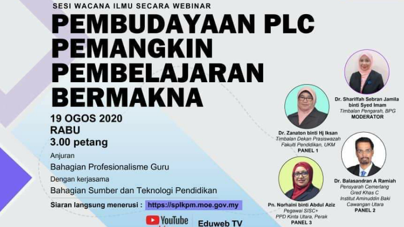 Jangan lupa untuk sertai Webinar Wacana Ilmu: Pembudayaan PLC Pemangkin Pembelajaran Bermakna akan berlangsung pada ketetapan berikut: